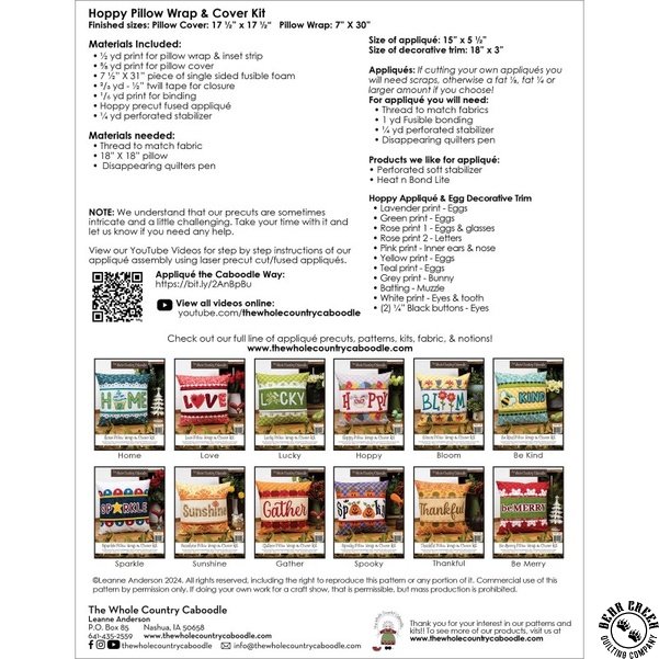 Wrapped with Words Pillow Wrap Kit includes instructions that will guide you through the process of creating a fun pillow cover, and an adorable pillow wrap. The applique pieces are all pre-cut and pre-fused for eas of use for most any skill level.