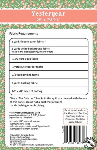 Yesteryear Quilt Pattern View Larger Image Price: SALE $8.39 4 item(s) available. Item # PTN-CQ225 | Reg. $11.99 Tweet Pin It Yesteryear Quilt PatternFeaturing the Abloom fabric collection by Moda. Pattern and instructions; fabric not included Finished size is 59 inches by 70 1/2 inches Designed by Corey Yoder Published by Corainder Quilts Copyright 2025 Related Products Handiwork Quilt Pattern Item # PTN-CQ224 | Reg. $11.99 SALE from $8.39 Moda Abloom Little Sprout Stone Item # 29216-20 $10.99